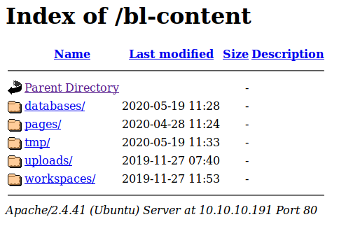 root@kali:/HackTheBox/Machine/Blunder# gobuster dir -u http://10.10.10.191/ -w /usr/share/wordlists/seclists/Discovery/Web-Content/directory-list-2.3-medium.txt -t 40 -x .html,.php,.txt,.old