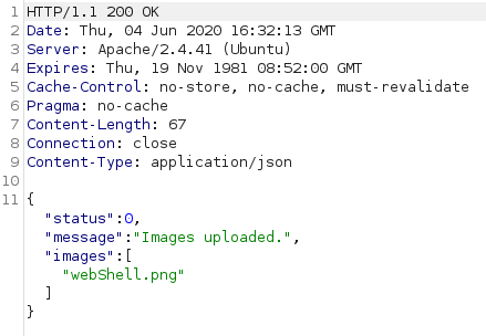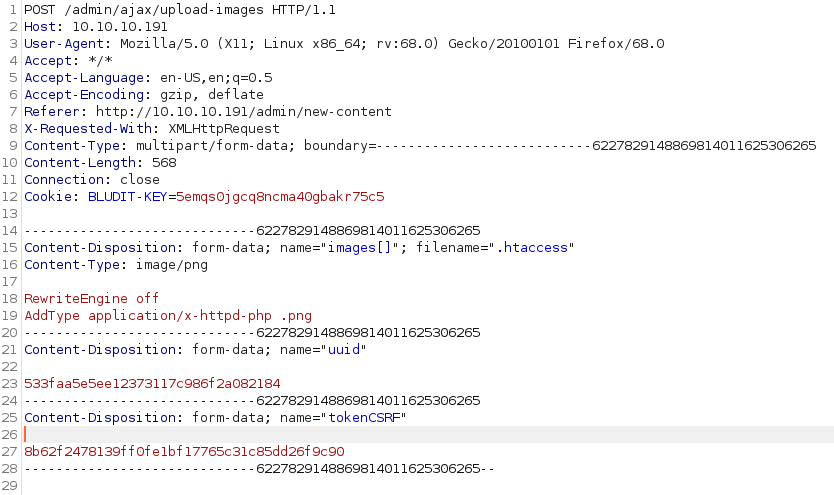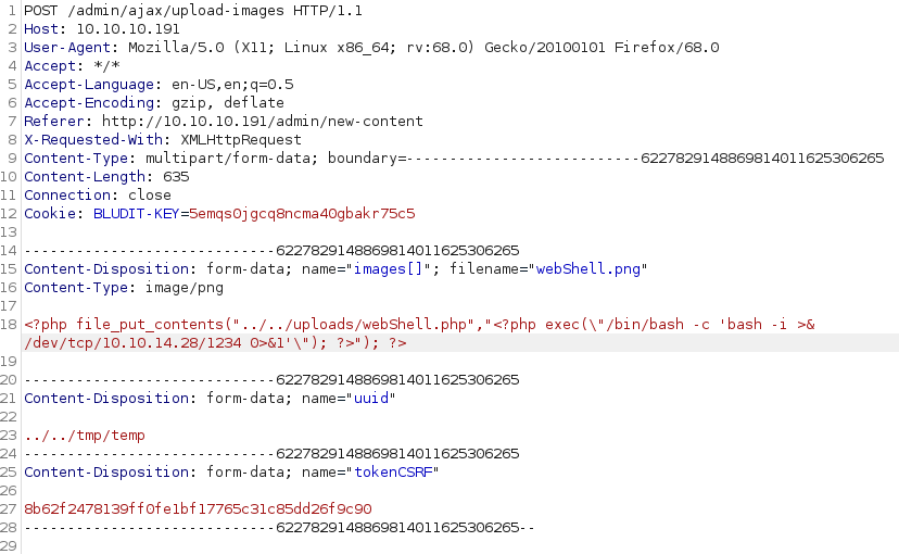 Using Burp Suite we intercept and edit the image upload request in order to arbitrary change the path where the image will be saved (editing the uuid field) and injecting our php payload.