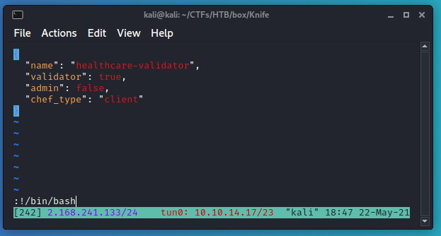 Knife is a Easy difficulty Linux box from HackTheBox based on the exploitation of a backdoored PHP version. After having identified the backdoor by inspecting the source code on GitHub it is possible to obtain code execution and obtain an access as james. The user is allowed to run knife with high privileges. Since knife allows to edit files using vi and it does not drop privileges, it is possible to leverage this issue and escalate to root spawning an interactive shell from within vi.