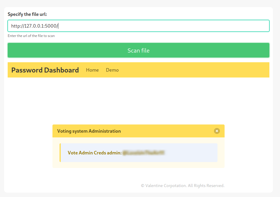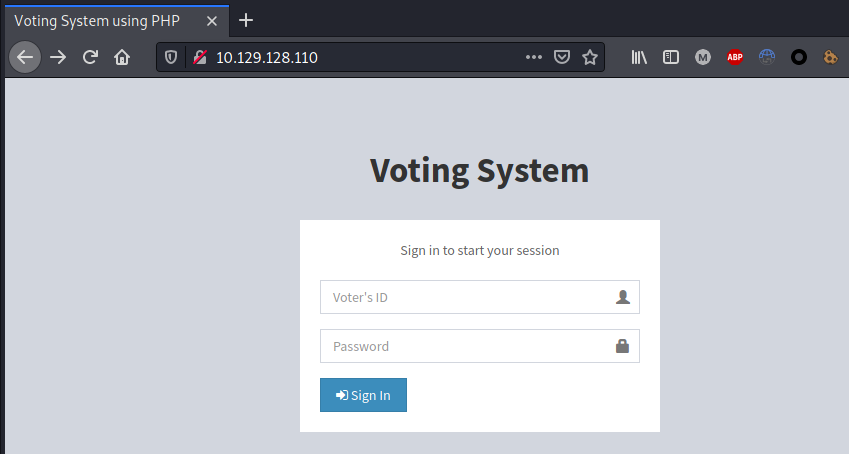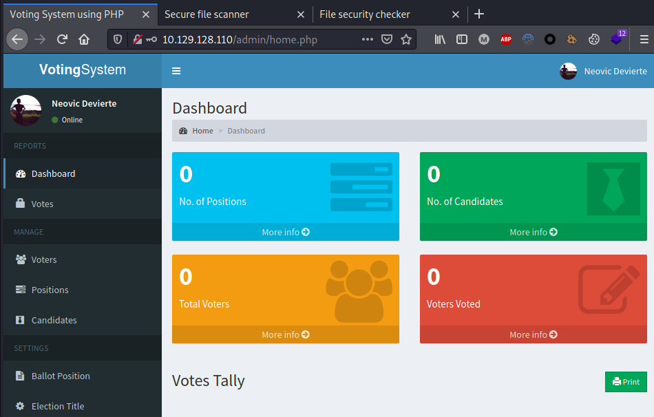 The web application running on port 5000 disclosed some credentials that can be used to access the admin ‘Voting System’ panel on port 80: