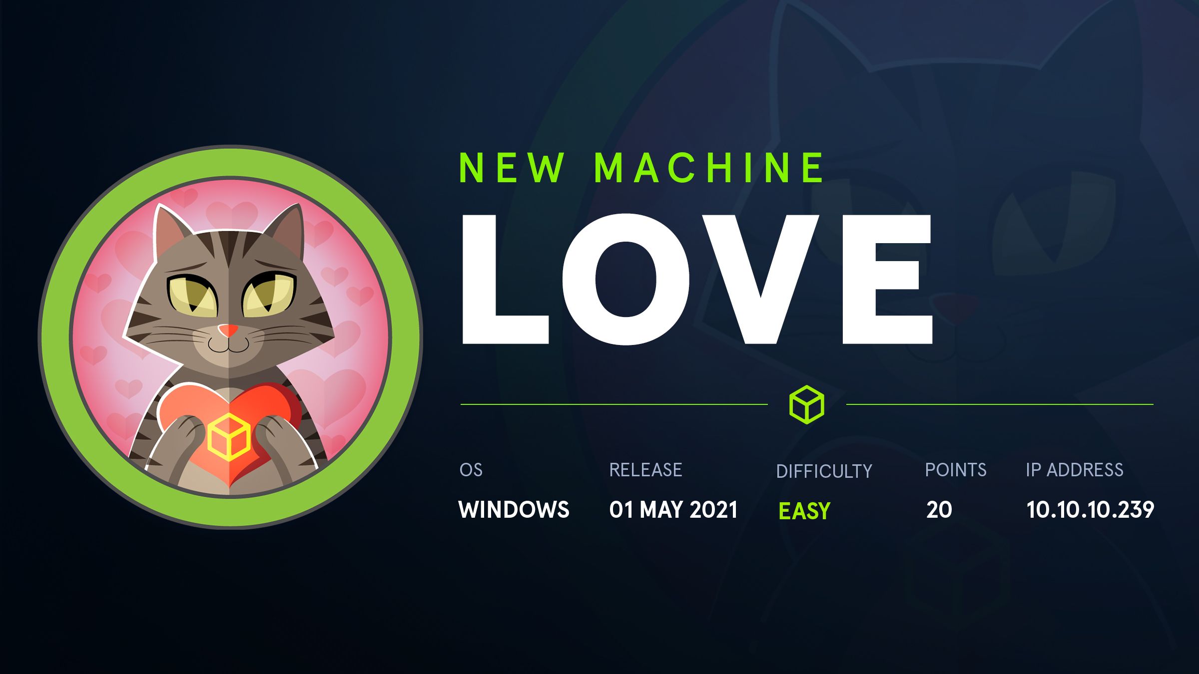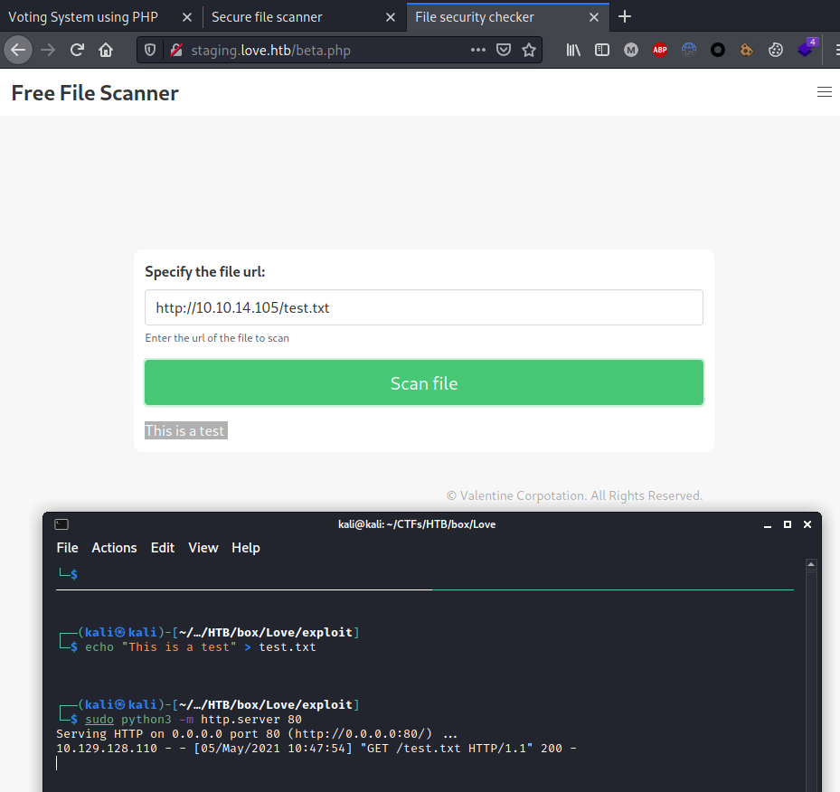 Love is a Easy difficulty Windows machine based on the exploitation of a SSRF to enumerate local contents, disclose administrative credentials and access a restricted area vulnerable to arbitrary file upload. Privilege escalation can be achieved abusing the AlwaysInstallElevated privileges.