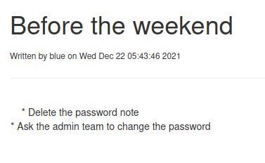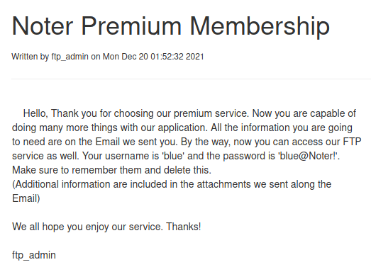 - Enumerating blue’s notes it was possible to discover its credentials and access FTP. Inside its notes it was also possible to discover the ftp_admin user