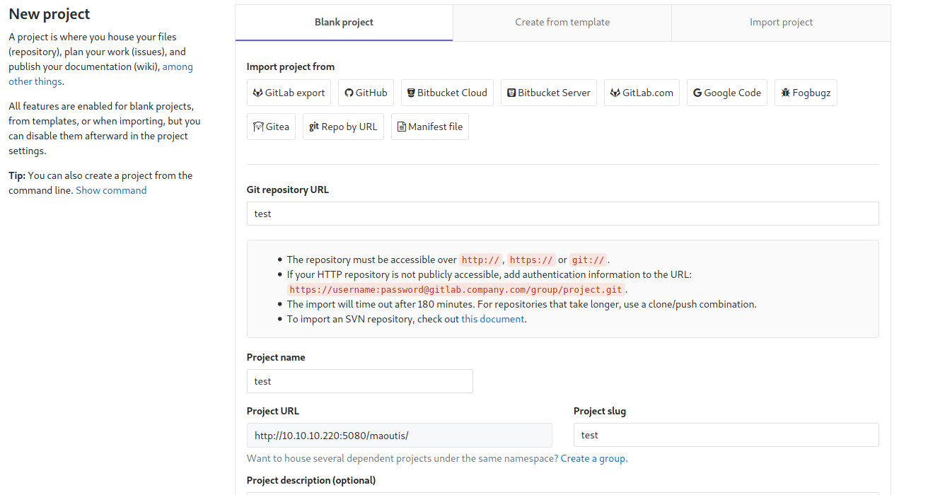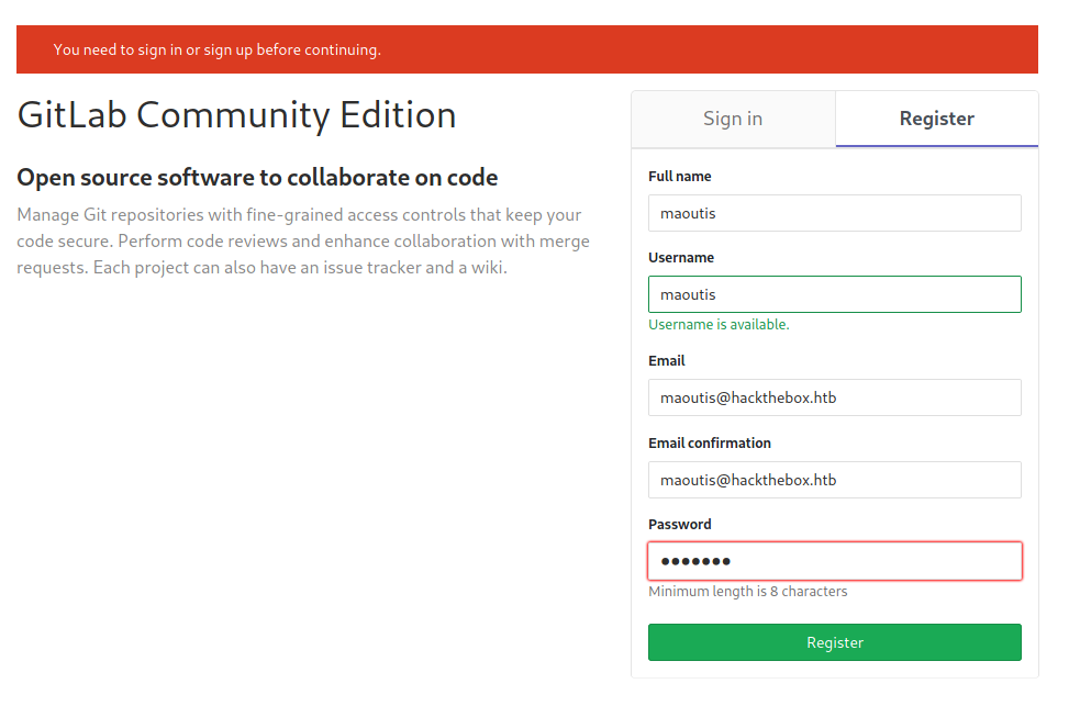 A custom account was registered in order to access the GitLab instance: