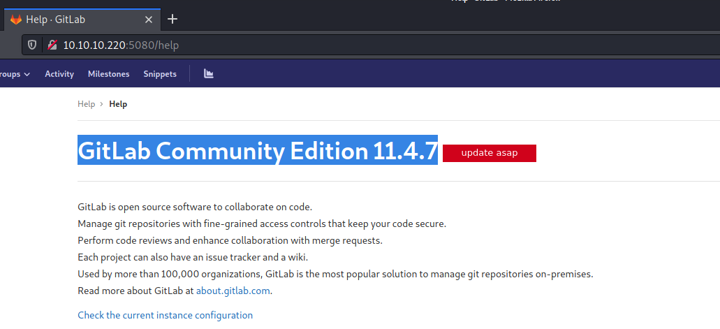 After get logged in, GitLab Version was enumerated from the “help” page:
