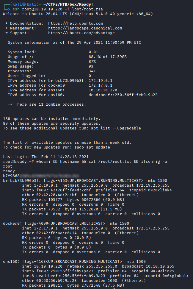 root@ready:~# whoami && hostname && cat /root/root.txt && ifconfig -a