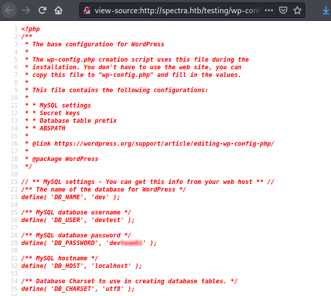 Looking through the directory list instead allowed to find a backup of the wp-admin.php file, containing credentials for the devtest user: