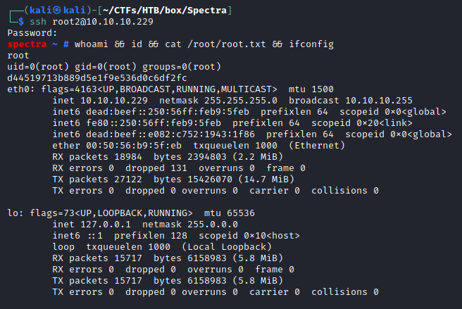 spectra ~ # whoami && id && cat /root/root.txt && ifconfig