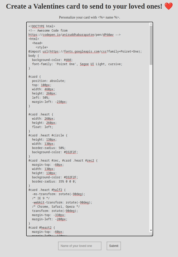 Valentine is an easy-difficulty web challenge from the hxp 2022 CTF, involving the exploitation of a Server Side Template Injection vulnerability useful to obtain remote code execution. The exploitation is possible thanks to an undocumented feature in Express and EJS that allows bypassing the security checks made by the application and rendering arbitrary templates. The intended solution adopted a similar approach but used a documented feature that will be covered in the final chapter.