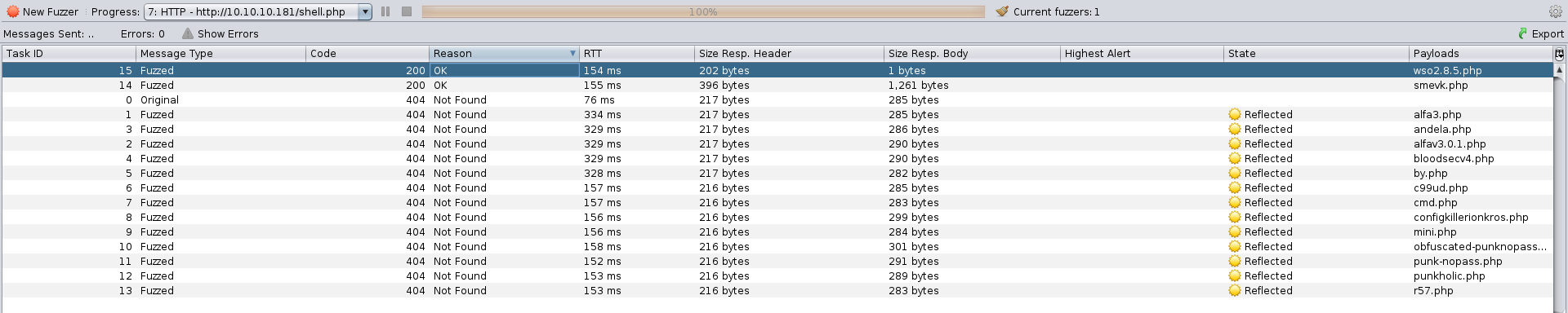 Assuming this, lets create a wordlist using the discovered shells’ name and fuzz the web page in order to find the correct one.