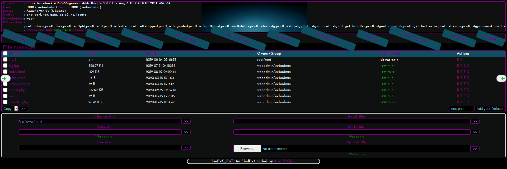 Bingo! smevk.php is the web shell used on the box.
