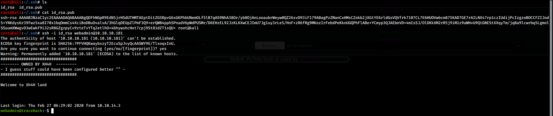 In order to get a more stable and comfortable shell, I added my SSH key to the authorized_keys file, obtaining an SSH access as webadmin.