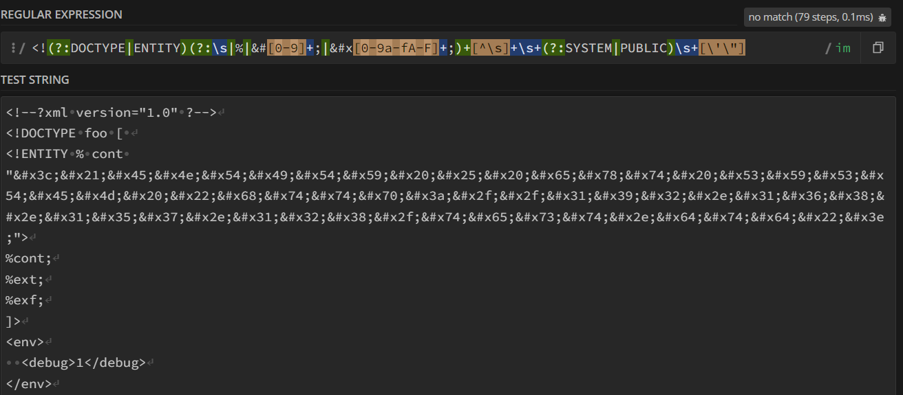 Now we have to find a way to bypass this second regex preventing us to inject malicious external entities.